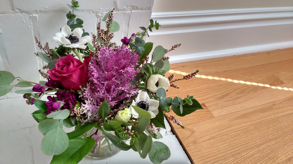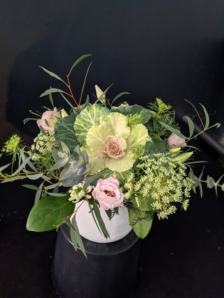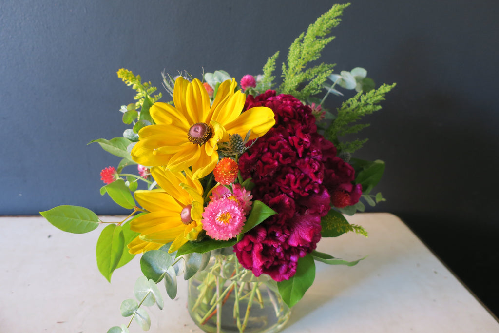 Our designer's choice arrangement includes seasonal fresh flowers, often with local picks from area flower farms.