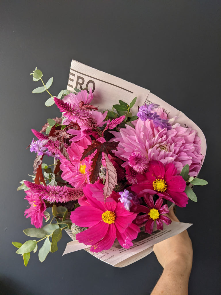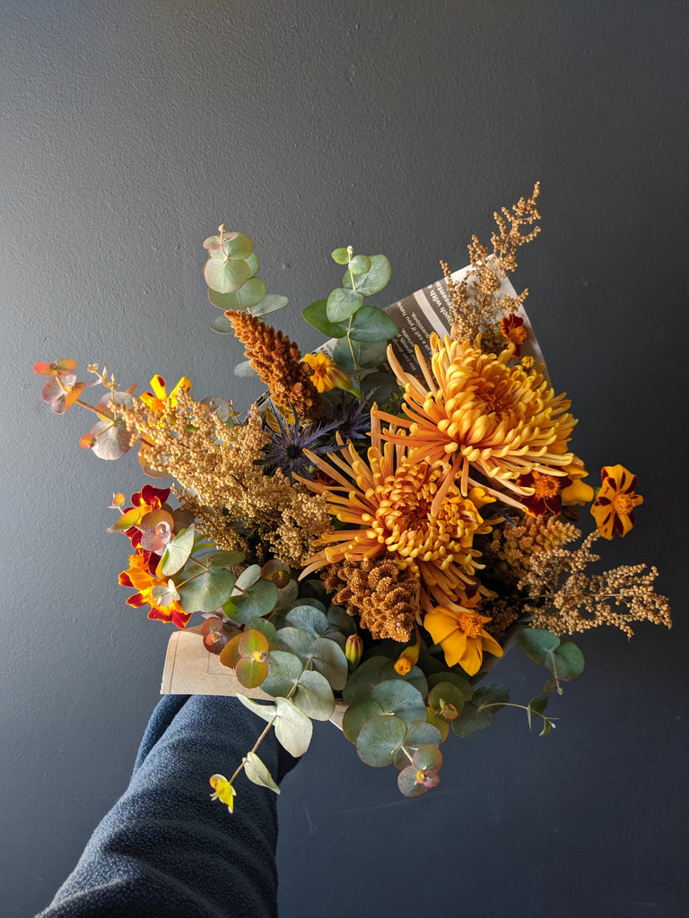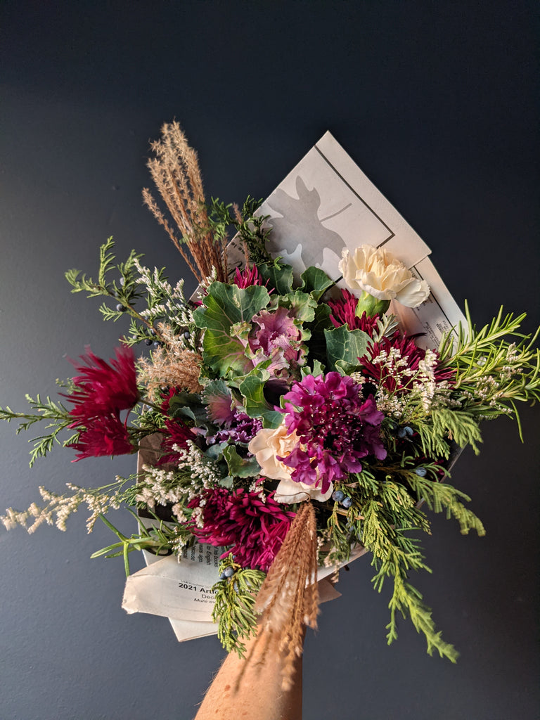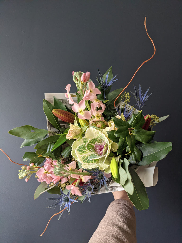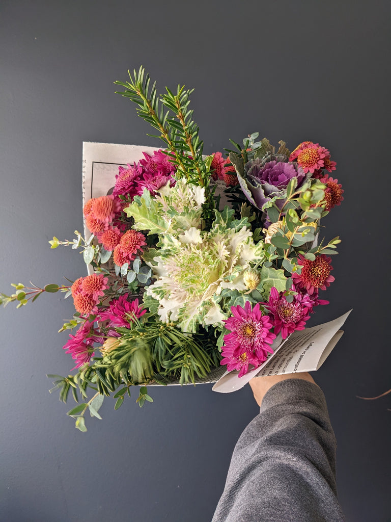 Our designer's choice grab 'n go bouquet includes seasonal fresh flowers, often with local picks from area flower farms. Our grab 'n go bouquets are wrapped in newspaper without a vase, so you can enjoy arranging at home.